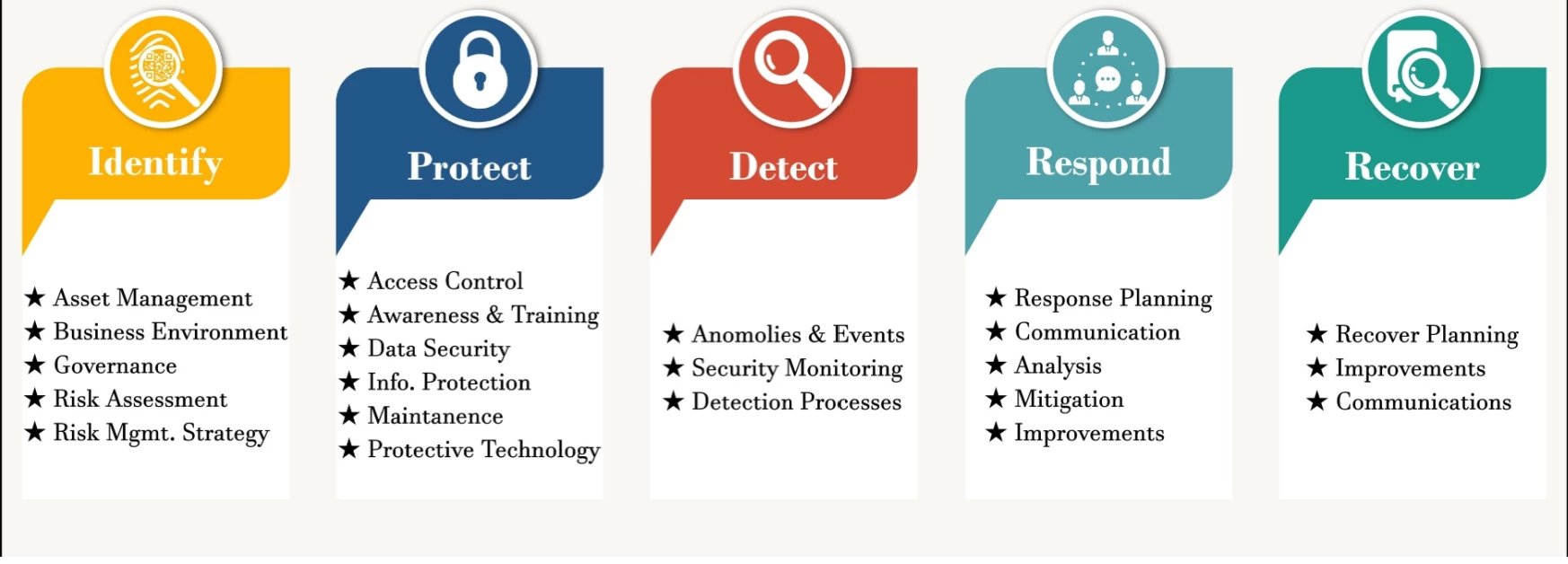 5. Recover: The final function includes the recovery activities which are implemented to ensure cyber resilience and business continuity in the event of a cyber incident. Recovery function categories include recovery planning, improvements, and lessons learned.