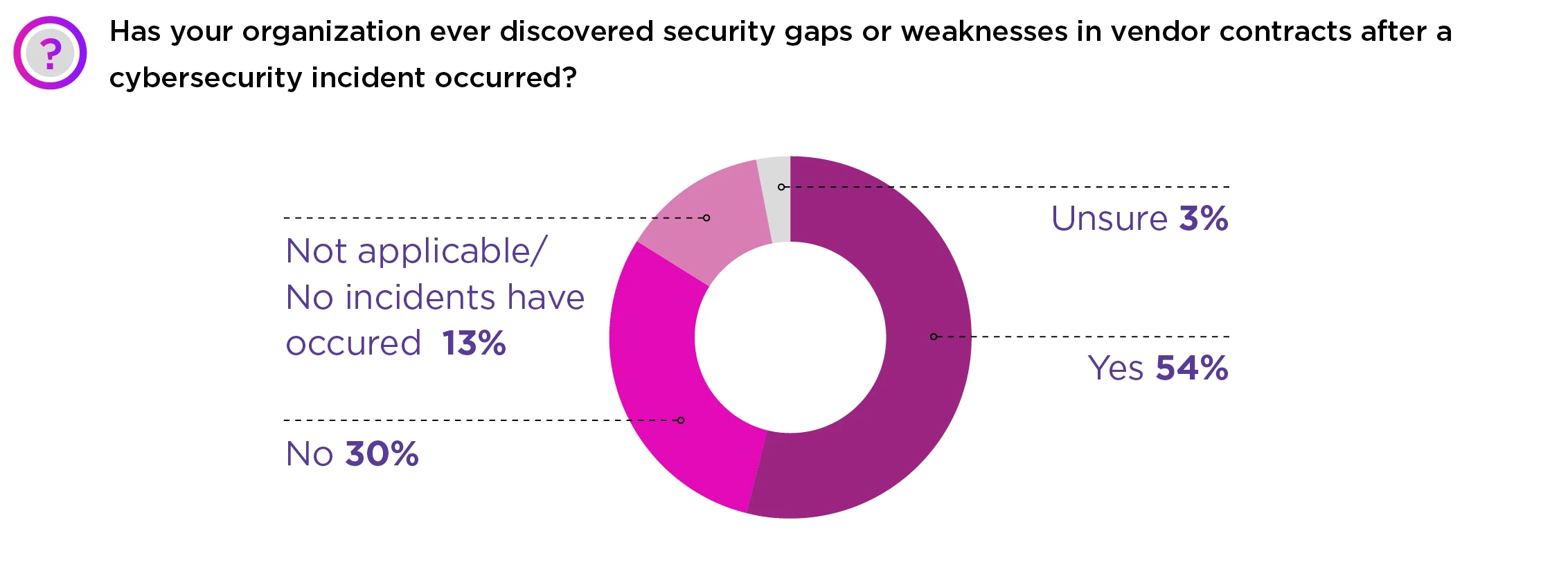 The risks of CPS exposure are too great, and the potential for disruption to assets and processes are too devastating not to have an adequate handle on a partner as a potential threat vector. 46% of respondents said their organizations had experienced a breach via third-party vendor access and business operations were disrupted. Furthermore, any gaps in vendor contracts were discovered only post-breach.