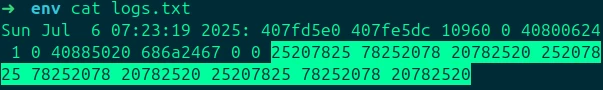 When inspecting the content of the log file with observations of the stack contents on our connected remote pwndbg we can see that our format-string associates stack content further down.