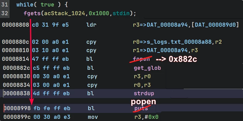 By doing so we make the get_glob method return our own shell command payload string pointer into register R0.
