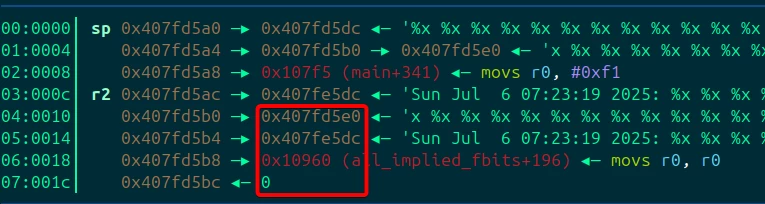 Now if we look further in the stack we can even see that our payload string is also located on the stack and enables us to have control over format-string references pointer variables.