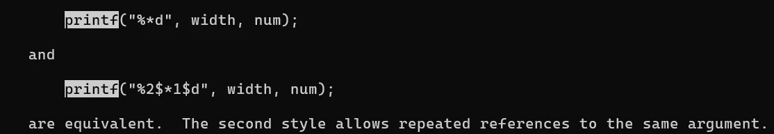 Printf MAN page snippet regarding the $ format specifier control character (man 3 printf)